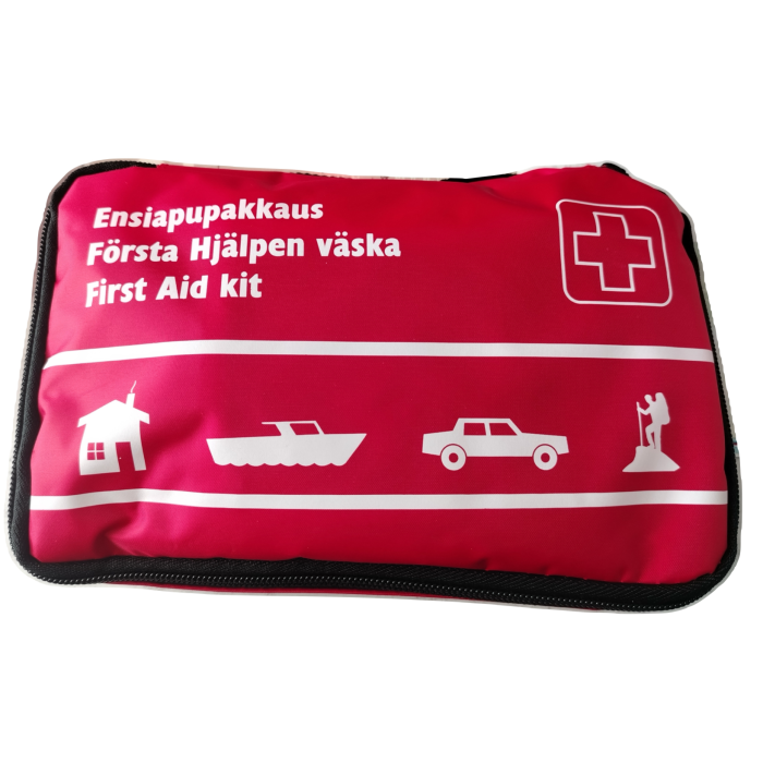 Första hjälpen-paket med mångsidigt innehåll passar många behov: hemmet, bilen, stugan och båten. Väska 23 x 14 x 6 cm Innehåll: 1 st Fästremsa 5mx2.5m, 8 st Klippbar plåster 10cm x 6cm, 1 st Första hjälpen-bandage 8 x 10 cm, 1 st Skyddbandage 60x40cm, 2 st Skyddbandage 60x80cm, 1 st Elastiskt bandage 8cmx400cm, 2 st Bandage 10x10cm, 1 st Triangelbind 136x96x96, 4 st Skyddshandskar, innehållsförteckning och första hjälpen-instruktioner